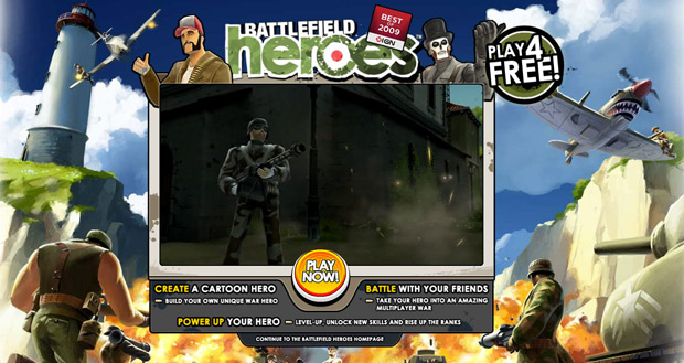 O Battlefield Heros é um título de guerra em formato de cartoon 3D, que tem vindo a ser desenvolvido pela Electronic Arts. Os gráficos são extremamente interessantes e os jogadores têm a possibilidade de caracterizar os seus personagens à medida que vão evoluindo no jogo. https://www.battlefieldheroes.com/en/frontpage/landingPage