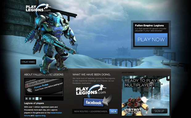 O jogo Fallen Empire: Legions é um shooter na primeira pessoa, onde os jogadores voam pelos cenários com um jetpack, disparando sobre os inimigos em modos deathmatch. Este jogo tem a particularidade de poder ser jogado com até 32 jogadores em simultâneo e em tempo real. O jogo apresenta um grafismo 3D impressionante, especialmente para um título baseado em browser. https://legions.instantaction.com/