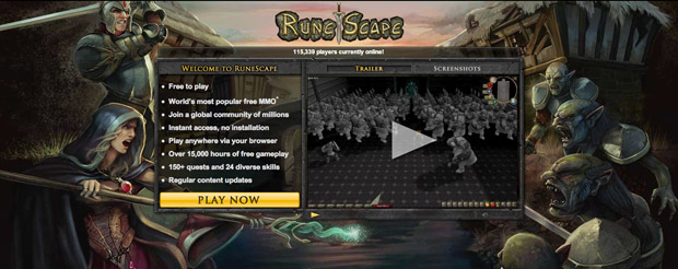 O RuneScape é um dos títulos mais conhecidos do mundo online. É alimentado por Java e oferece um nível de renderização gráfico 3D fantástico. Ele é um MMORPG do estilo fantástico, que permite aos jogadores viajarem por diversos reinos, cidades, etc., utilizando magia, feitiços e outros poderes fantásticos. https://www.runescape.com/